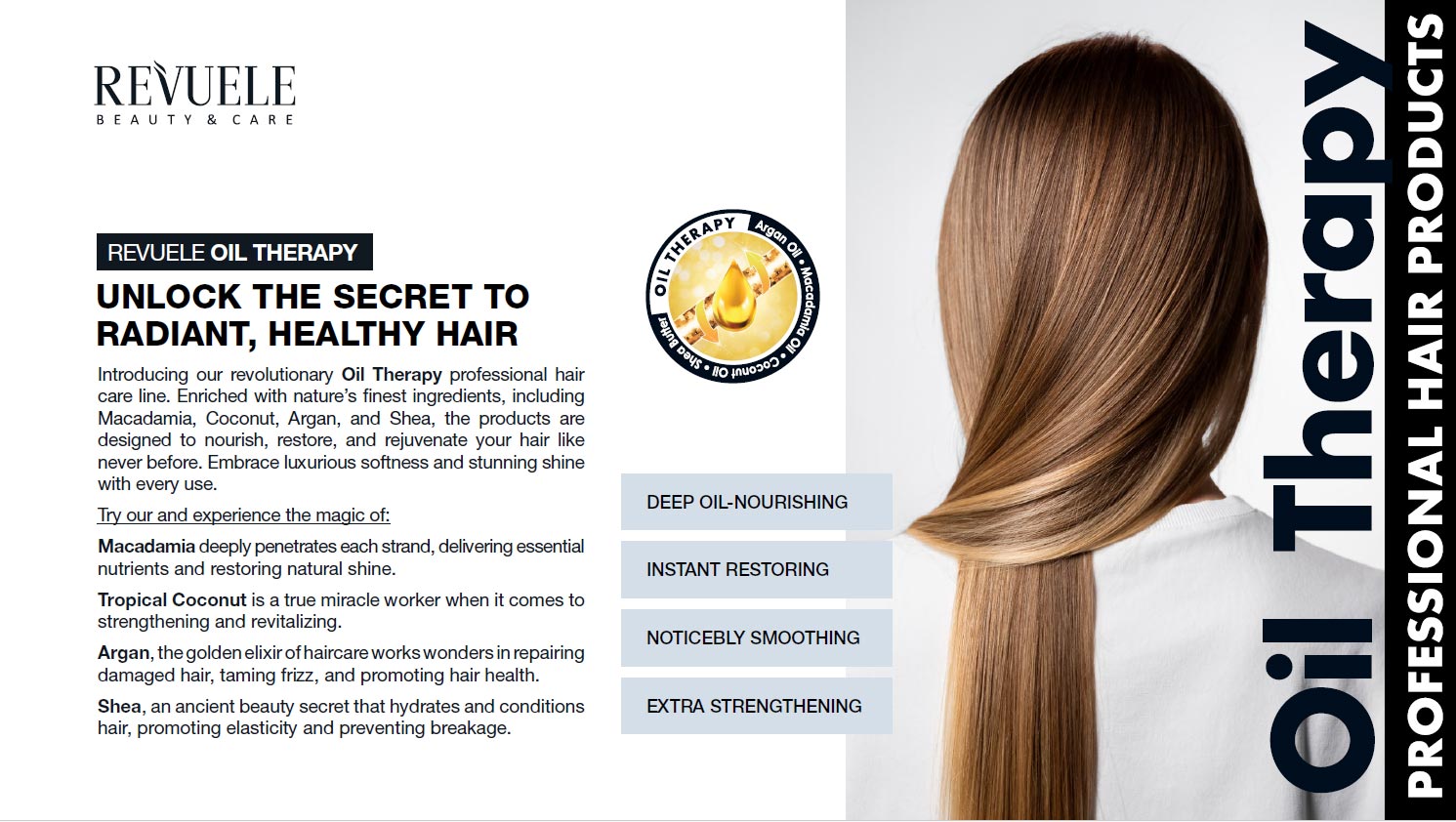 Σου παρουσιάζουμε τη νέα επαναστατική σειρά επαγγελματικής περιποίησης μαλλιών Oil Therapy. Εμπλουτισμένη με τα καλύτερα φυσικά συστατικά, όπως Μακαντάμια, Καρύδα, Αργκάν και Βούτυρο Καριτέ, η σειρά έχει σχεδιαστεί για να θρέφει, να επανορθώνει και να αναζωογονεί τα μαλλιά σου όπως ποτέ άλλοτε. Απόλαυσε πολυτελή απαλότητα και εκθαμβωτική λάμψη σε κάθε χρήση.