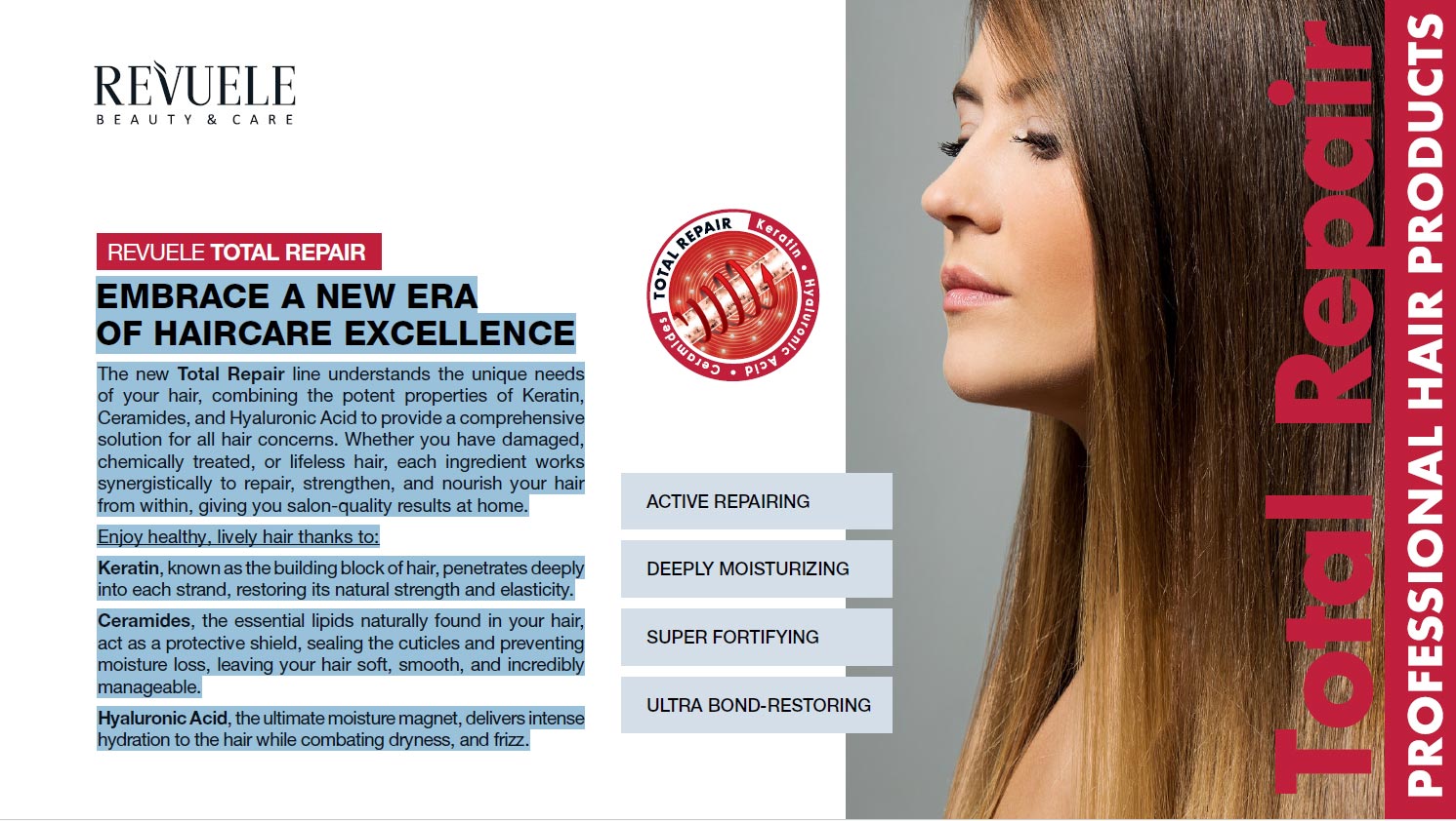 Η νέα σειρά Total Repair κατανοεί τις μοναδικές ανάγκες των μαλλιών σου, συνδυάζοντας τις ισχυρές ιδιότητες της Κερατίνης, των Κεραμιδίων και του Υαλουρονικού Οξέος, για να προσφέρει μια ολοκληρωμένη λύση για κάθε πρόβλημα μαλλιών. Είτε έχεις ταλαιπωρημένα, χημικά επεξεργασμένα ή άτονα μαλλιά, κάθε συστατικό συνεργάζεται για να επανορθώσει, να ενισχύσει και να θρέψει τα μαλλιά σου από τη ρίζα, προσφέροντάς σου αποτελέσματα επιπέδου κομμωτηρίου στο σπίτι.