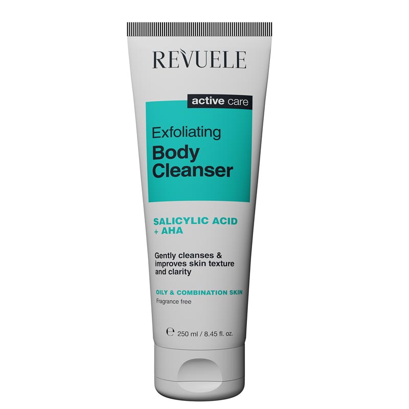 REVUELE EXFOLIATING BODY CLEANSER. Intensely purifies by unclogging pores, removing impurities and excess oil, leaving the skin exfoliated. The potent formula helps reduce the appearance of blemishes and reveals healthier-looking, clear skin. Active ingredients: Salicylic Acid helps to unclog pores and prevent breakouts. AHA exfoliates to improve skin texture and tone. Directions: AM or PM apply to wet body skin, lather, and rinse thoroughly with water. Use once a day, avoiding more sensitive areas. Caution: Individual intolerance to any of the ingredients is possible. Avoid contact with eyes! In case the product gets into the eyes, rinse thoroughly with water.