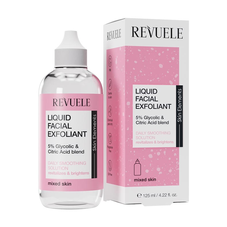 Skin Elements Liquid Facial Exfoliant 5% Glycolic + Citric Acid Blend, 125Ml. Εξαιρετικά απαλό καθημερινό διάλυμα λείανσης που αποτελείται από ένα μείγμα ήπιων οξέων απολέπισης. Κατάλληλο για combination Skin.